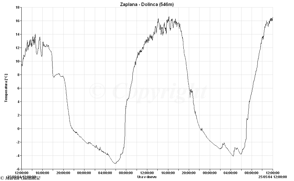 Po prehodu izrazite hladne fronte so ob jasnih noÄeh in ob pojemajoÄih vetrovih nastali dobri pogoji za moÄnejÅ¡e noÄne ohladitve. Najhladneje je bilo 24. in 25.maja V meteoroloÅ¡ki hiÅ¡ici se je na 2m viÅ¡ine ohladilo na 0,5°C, to pa pomeni, da so bile pri tleh temperature pod niÄlo. V Ljubljani je bila najnižja temperatura v teh dveh jutrih 4,0°C, Postojni 0,4°C in v RateÄah -2,7°C. V mraziÅ¡Äu Dolinca se je ohladilo na -5,2°C, kljub temu pa bi bile temperature tam lahko Å¡e nižje, saj je iz podatkov avtomatske postaje razvidno, da pogoji za moÄnejÅ¡e ohladitve niso bili niti približno idealni (verjetno je bilo nekaj megle, oblakov, pa tudi vetrovi so nekajkrat premeÅ¡ali temperaturno inverzijo).