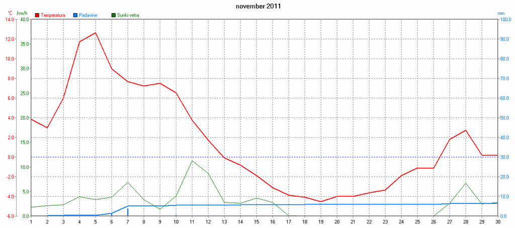 PovpreÄna dnevna temperatura, veter in kumulativa padavin na Zaplani novembra 2011.