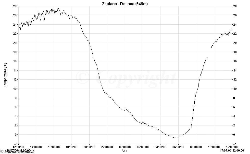 15.julija zveÄer je Slovenijo dosegel zelo suh zrak. Naslednji dan je bilo zelo suho, vendar ne preveÄ vroÄe vreme. Na meteoroloÅ¡ki opazovalnici se je Äez dan ogrelo na 24,9°C, relativna vlaga je bila Äez dan 31%. Kako suh zrak nas je dosegel tisti dan, se je pokazalo v noÄi na 17.julija, ko je znaÅ¡ala relativna vlaga Å¡e ob 3:00 zjutraj 55%! To je za Zaplano vsekakor izredno suha noÄ. Glede na nizke vrednosti vlage se je priÄakovalo, da se je ob jasnem nebu in Å¡ibkih vetrovih v mraziÅ¡Äih zelo ohladilo. In res sta naslednje jutro v mraziÅ¡Äu Dolinca, na nadmorski viÅ¡ini 546m, padla dva nova rekorda. Ohladilo se je na -0,7°C, kar je do sedaj najnižja julijska izmerjena temperatura. Hkrati je bila to do takrat najmoÄnejÅ¡a ohladitev v eni noÄi. V mraziÅ¡Äu se je namreÄ z dnevnih 27,5°C ohladilo na jutranjih -0,7°C! Torej se je ohladilo za 28,2°C, prejÅ¡nji rekord iz marca 2006 je bil presežen za 0,2°C. V noÄi na 18.julij se je v mraziÅ¡Äu ohladilo na 1,0°C.