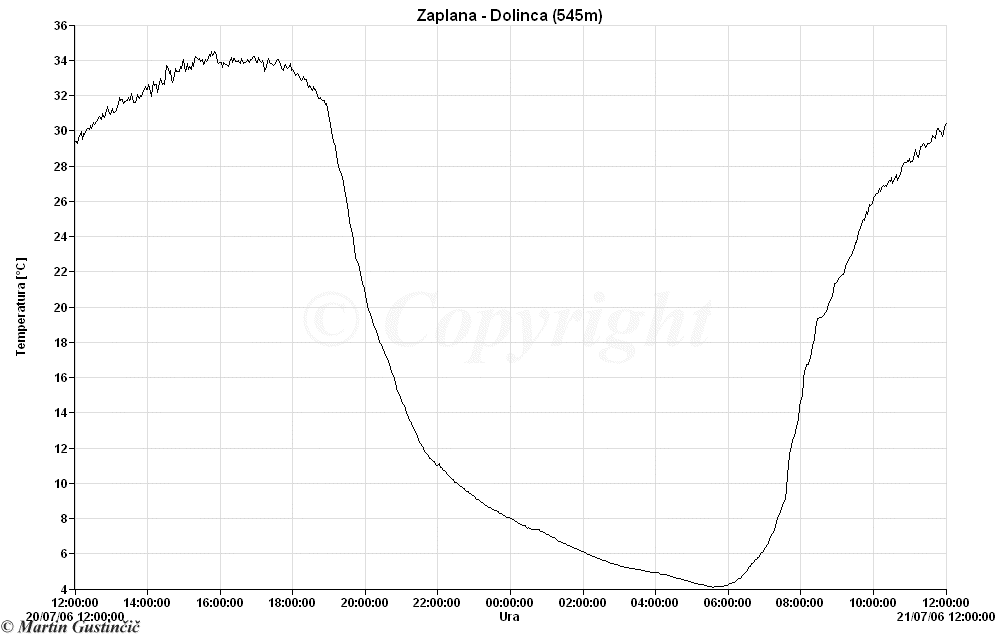V noÄi na 21.julij je bil v Dolinci spet dosežen nov rekord, saj se je z dnevnih 34,5°C ohladilo na jutranjih 4,1°C, torej kar 30,4K razlike. Vzrok so bila zaradi suÅ¡e izsuÅ¡ena tla ter nizka zraÄna vlaga, saj je bila dan prej na meteoroloÅ¡ki postaji vlaga 21%, ob polnoÄi je bila 49%, zjutraj pa 85%. Popoldne je bilo izmerjeno 32,3°C, zjutraj pa 13,5°C. K temu rekordu v Dolinci je zagotovo pripomogla tudi slabÅ¡a zaÅ¡Äita termometra proti sonÄnemu sevanju, ki tako prispeva k viÅ¡jim dnevnim temperaturam in poslediÄno k veÄjim dnevnim amplitudam. Kljub temu pa ta napaka ni velika, v zatiÅ¡ni Dolinci je zagotovo bolj vroÄe kot v bolj prevetreni okolici. Nenazadnje je termometer v Dolinci postavljen tudi ob bolj toplem prisojnem poboÄju.