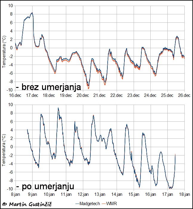 Primer umerjanja enega izmed Madgetechovih termometrov na samodejno vremensko postajo Zaplana (WMR). Umerjanje termometrov na samodejno postajo opraviÄujejo tudi klasiÄni tekoÄinski termometri.