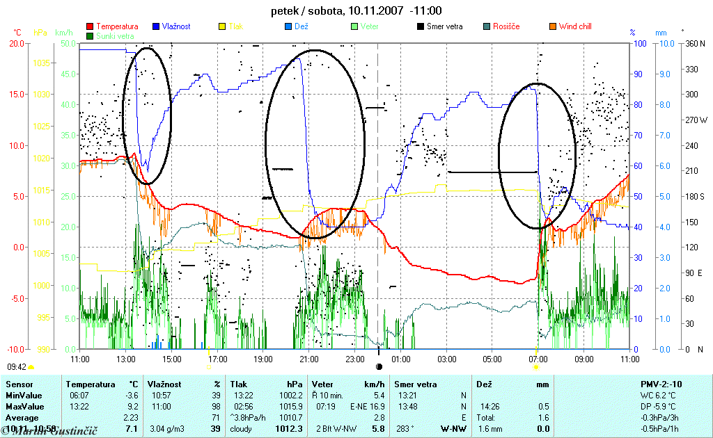 Na vremenski postaji Zaplana je bilo že veÄkrat zabeleženo hitro in izrazito menjavanje zraÄne mase, kar pomeni da se v zelo kratkem Äasu, vÄasih tudi v nekaj minutah zraku bistveno spremenijo temperaturne in vlažnostne lastnosti. V petek 9.novembra so padavine ponehale, zapihal je severni veter in ozraÄje se je prehodno izsuÅ¡ilo, saj je zraÄna vlažnost precej padla. Veter je bil pa razmeroma Å¡ibak in je kmalu ponehal. Na Zaplani se je zveÄer priÄelo moÄno hladiti, nastala je le nekaj deset metrov debela temperaturna inverzija, ki jo je pa severni veter spet premeÅ¡al okoli 21:00 ure. PriÅ¡lo je do druge moÄne izsuÅ¡itve ozraÄja, saj se je temperatura v dobri uri dvignila za 3°C, vlaga pa je padla iz 94% na 40%. PonoÄi se je veter polegel, spet je nastala plitva temperaturna inverzija (na Spodnji Zaplani je bilo skoraj -4°C), ki jo je zjutraj že tretjiÄ razpihal veter. Tokrat je zapihal zahodnik in temperatura je iz -3°C narasla na +3°C v približno desetih minutah. Bližnjo zasebno meteoroloÅ¡ko postajo Petkovec je veter prevetril nekoliko pozneje, a je bilo to dovolj, da je temperaturna razlika med obema postajama prehodno znaÅ¡ala dobrih 7°C.