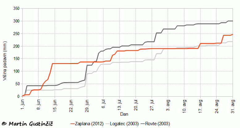 Podatki kažejo, da je bilo poletje 2003 zaradi ugodnejÅ¡e razporeditve padavin na obmoÄju Zaplane manj suÅ¡no od letoÅ¡njega poletja. V spodnjem grafikonu so podatki o letoÅ¡njih padavinah na vremenski postaji Zaplana in padavinah v Rovtah in Logatcu za leto 2003. Pri interpretaciji podatkov je potrebno upoÅ¡tevati dejstvo, da je letos zaradi lokalnih neviht v okolici Vrhnike in na Zaplani padlo veÄ dežja kot v Logatcu ter v njegovem zahodnem in južnem zaledju. Po podatkih zasebne vremenske postaje je v poletju 2012 v Logatcu padlo samo 206 mm padavin. Tako so bile v veÄini krajev obÄine Logatec padavinske razmere Å¡e slabÅ¡e od razmer, ki jih kaže spodnji grafikon za obmoÄje Zaplane.