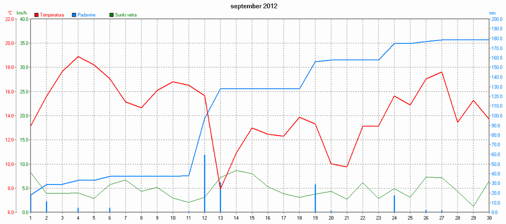 PovpreÄna dnevna temperatura, veter in kumulativa padavin na Zaplani septembra 2012.