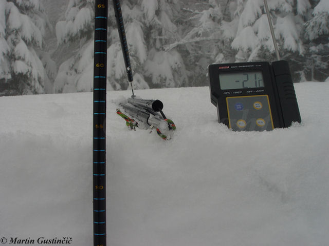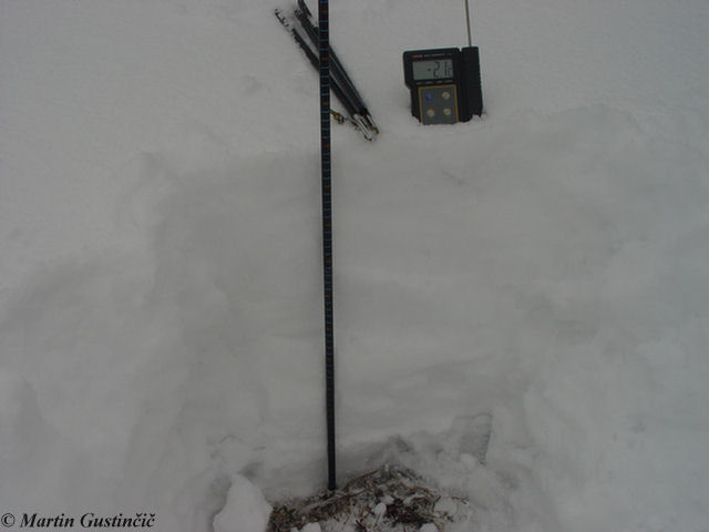24.3.2008, 7:00: sneži, 36cm snega. Posedanje snega, ponoÄi temperatura nad niÄlo. V enem od mraziÅ¡Ä 45cm snega.