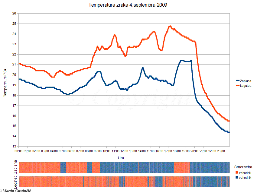 Temperatura zraka v Äasu južnih vetrov 4.septembra 2009 na zasebnih meteoroloÅ¡kih postajah Gorenji Logatec in Spodnja Zaplana.