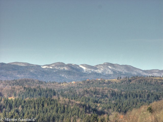 Pogled na 1200m visoko dinarsko gorsko pregrado na zahodu, ki ima velik vpliv na temperaturne in padavinske razmere na Zaplani. Na fotografiji sta Streliški vrh nad Podkrajem in Javornik nad Colom.