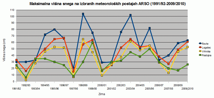 – zima 1975/1976: Legendarna zima, ko je prviÄ snežilo že 13.oktobra, vendar je bilo glavno dogajanje omejeno na februar in marec. Sredi februarja je bilo 120cm snega, nato se je snežna odeja nekoliko sesedala do sredine marca, ko je padlo v enem dnevu 70cm novega snega (ponekod na južnem Notranjskem celo 100cm), v dveh dneh pa skupno 100cm snega. Snežna odeja je bila visoka 131cm. 29.aprila je padlo 20cm novega snega.