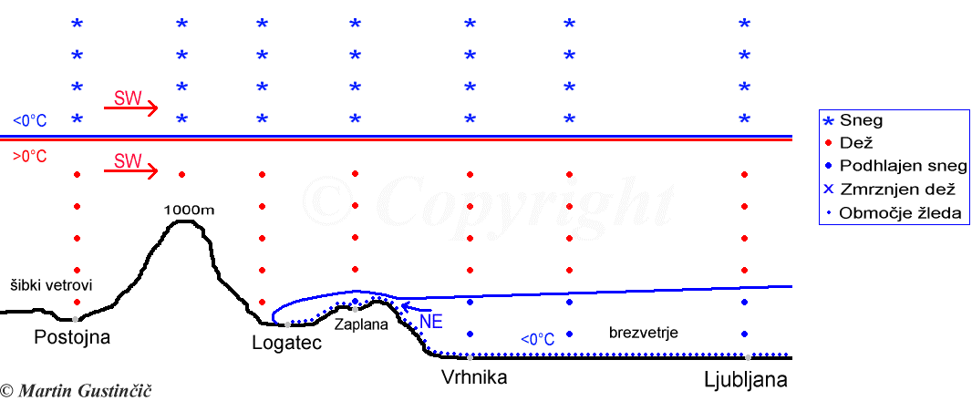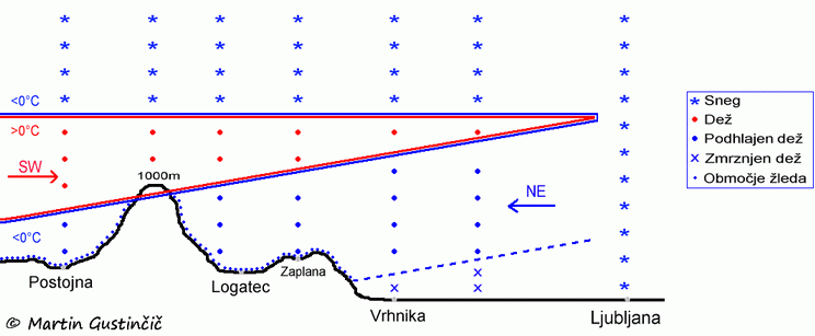 – topla plast zraka je pretanka, na Zaplani sneži. V takih primerih lahko žledi v južni Sloveniji (Brkini, Kras) in na HrvaÅ¡kem (Gorski Kotar, Lika).