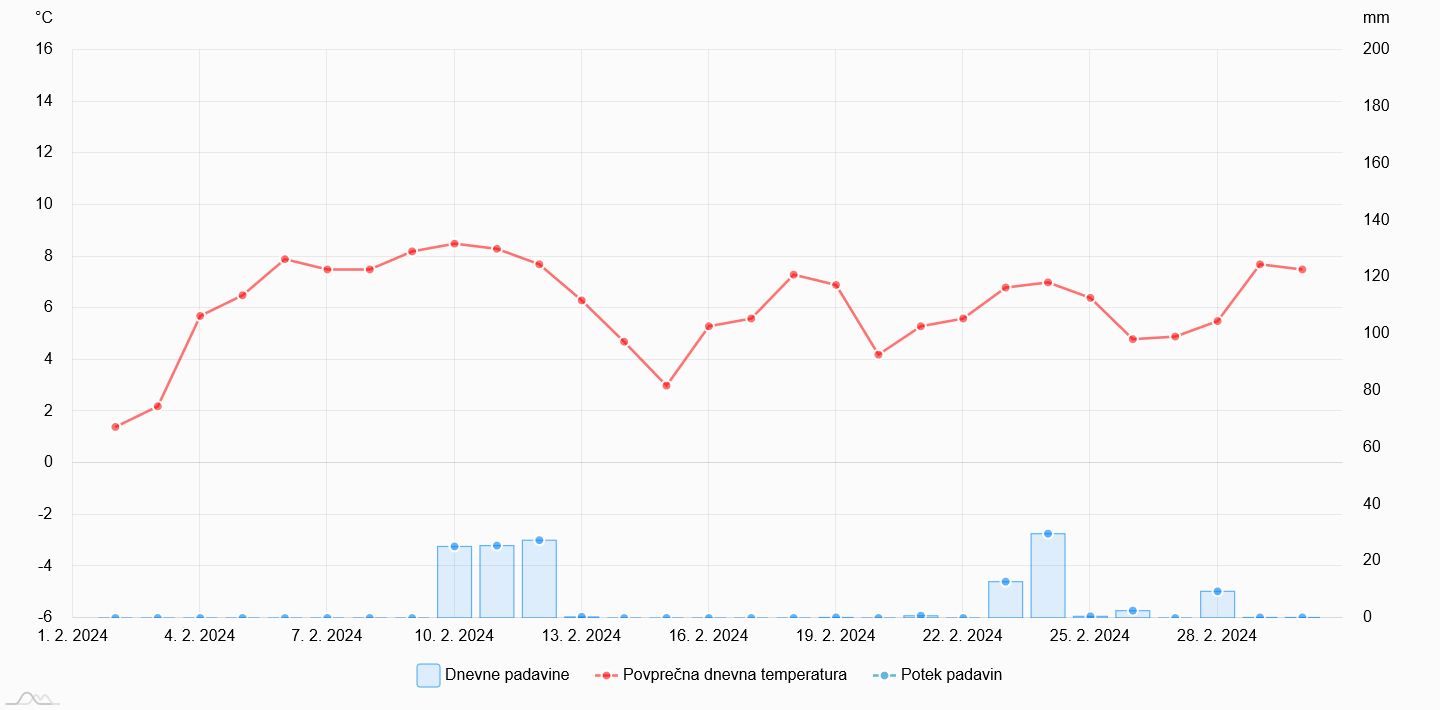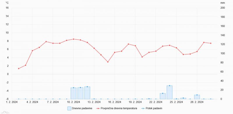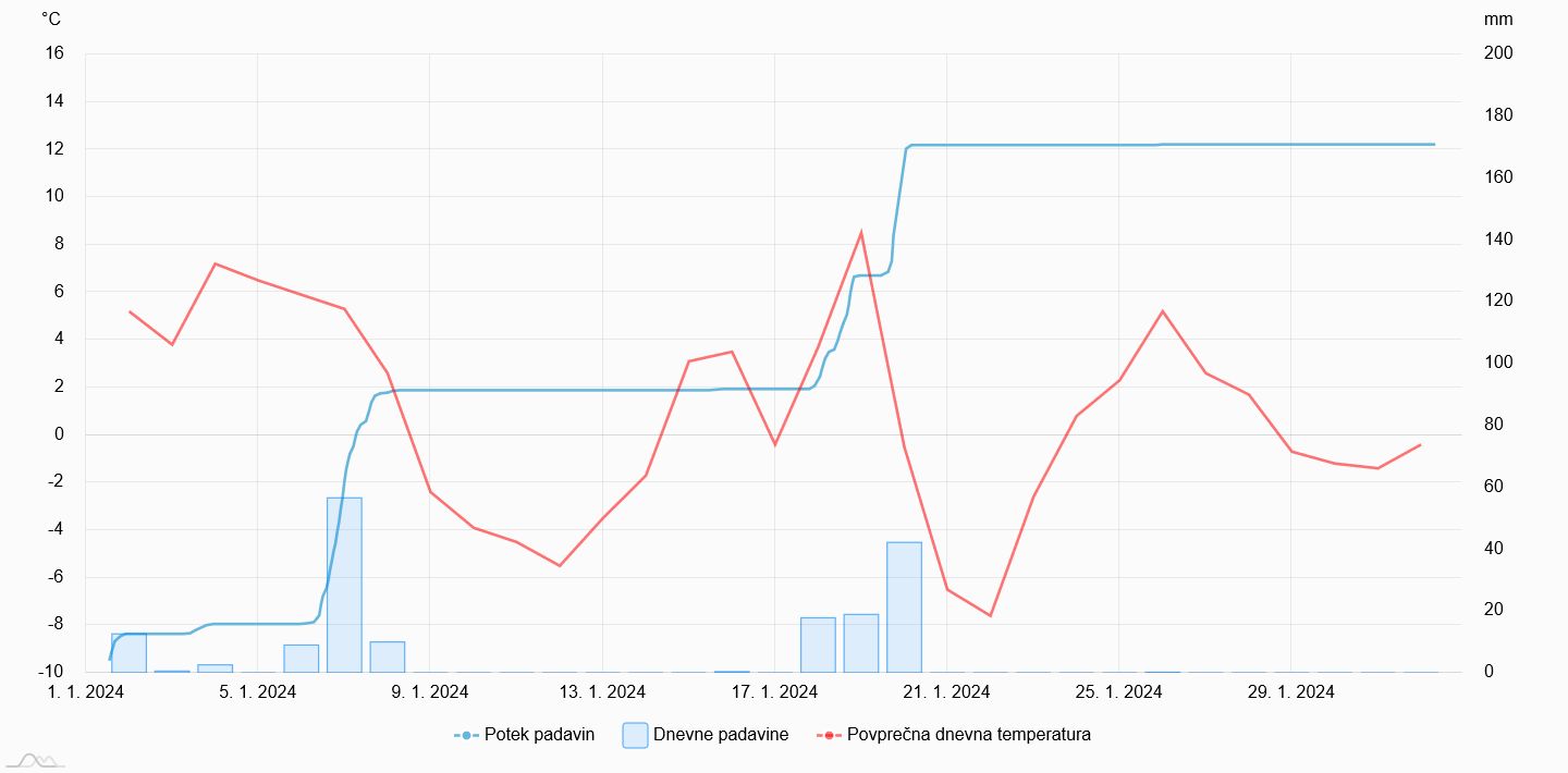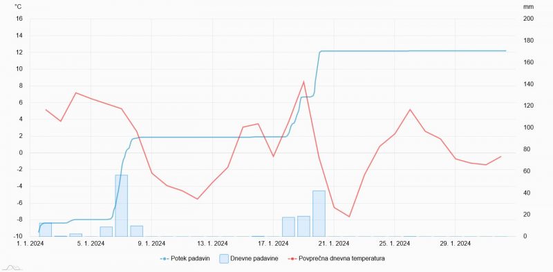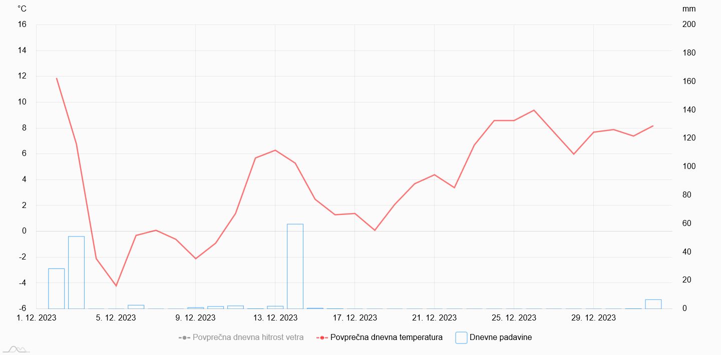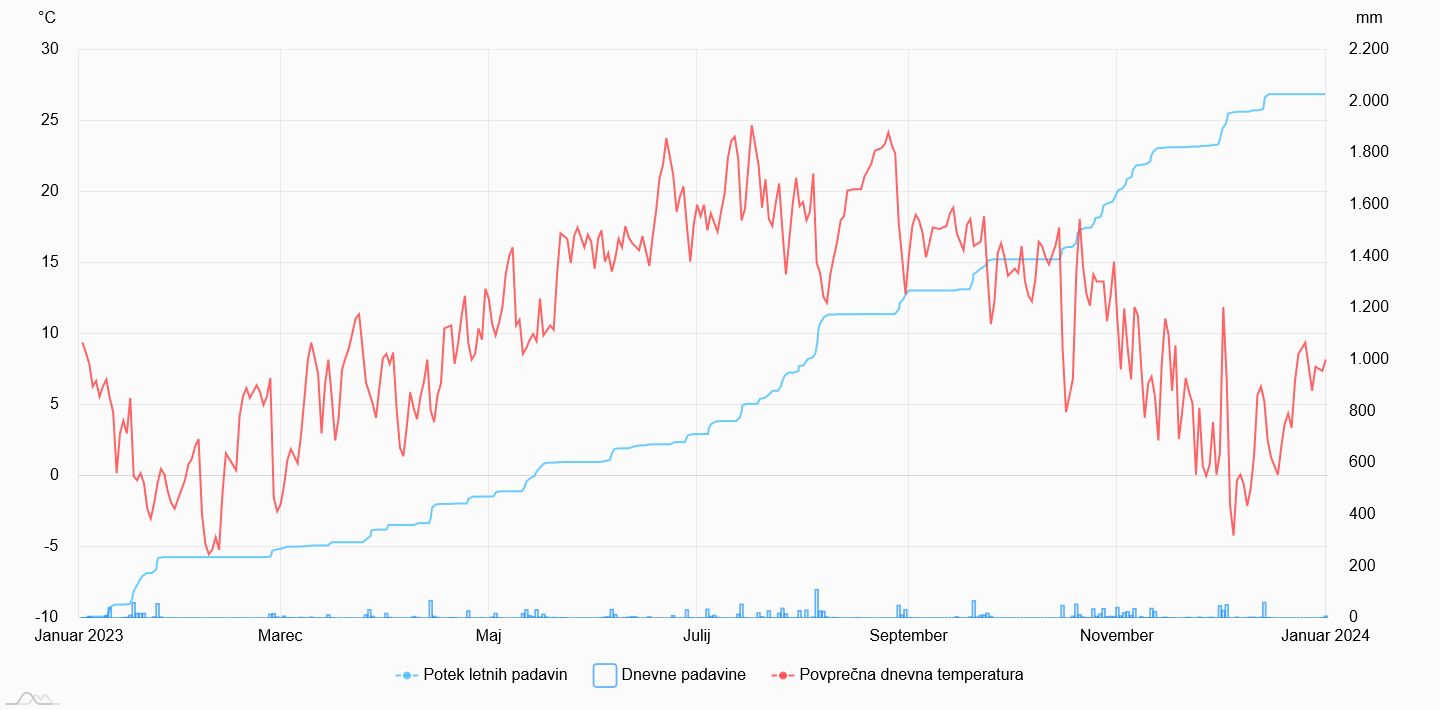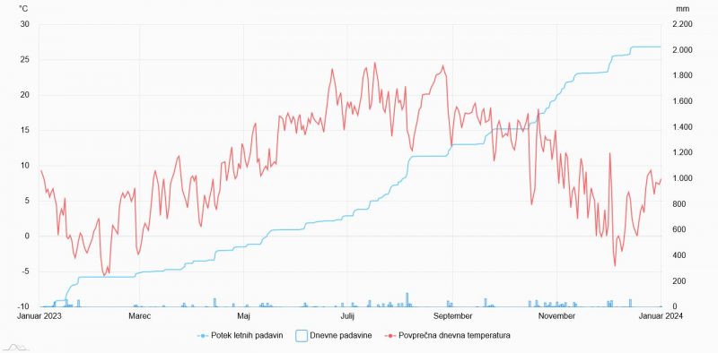 Povprecna dnevna temperatura in padavine na Zaplani v letu 2023.