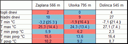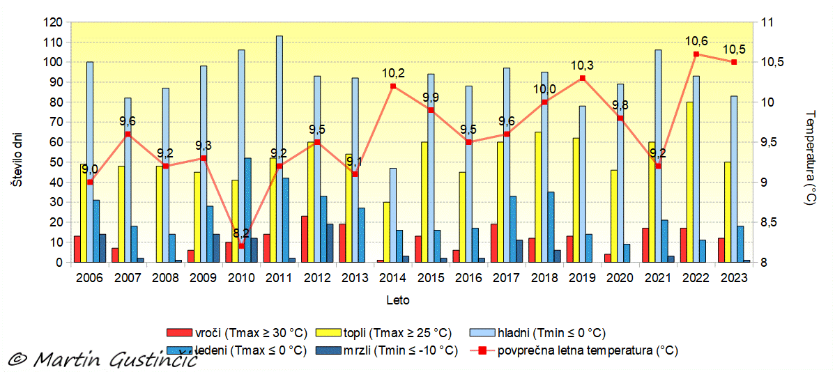 Drugo najtoplejše leto v zgodovini meritev potrjujejo tudi podatki o številu dni, ko je bil dosežen dolocen temperaturni prag. Manjše število toplih in vrocih dni je odraz deževnega poletja, manjše število hladnih dni pa oblacnega ter dezevnega vremena v nekaterih prehodnih mesecih, ko se je temperatura redkeje spuscala pod 0 °C kot bi se v primeru stabilnega vremena z vec jasnih in zato hladnejših noci.
